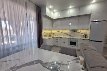 Планировка: Прихожая просторная (12,8 м2), кухня-гостинная 27,3 м2, кабинет или спальня 13,3 м2, спальные комнаты 14,4 и 14,9 м2, санузел 6 м2, установлена джакузи с лимфо-гидромассажем.