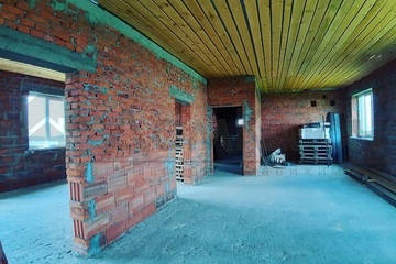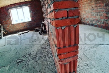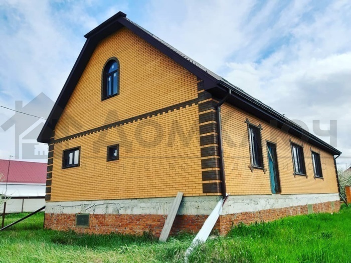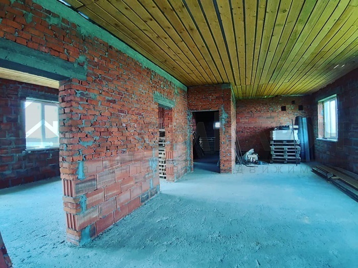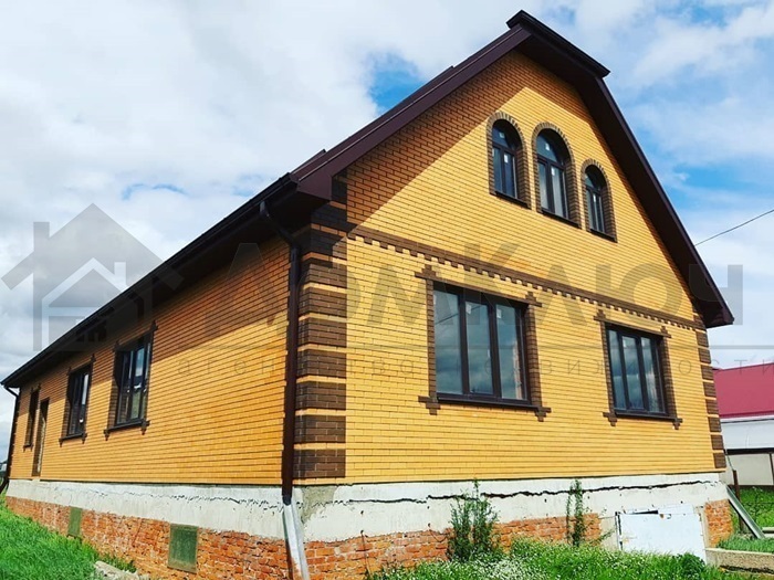 Дом из POROMAX, облицованный кирпичом. При строительстве использовались качественные материалы. Общая площадь дома 280 кв.м., цокольный этаж с гаражом, на 1 этаже помещение свободной планировки, мансардный этаж.